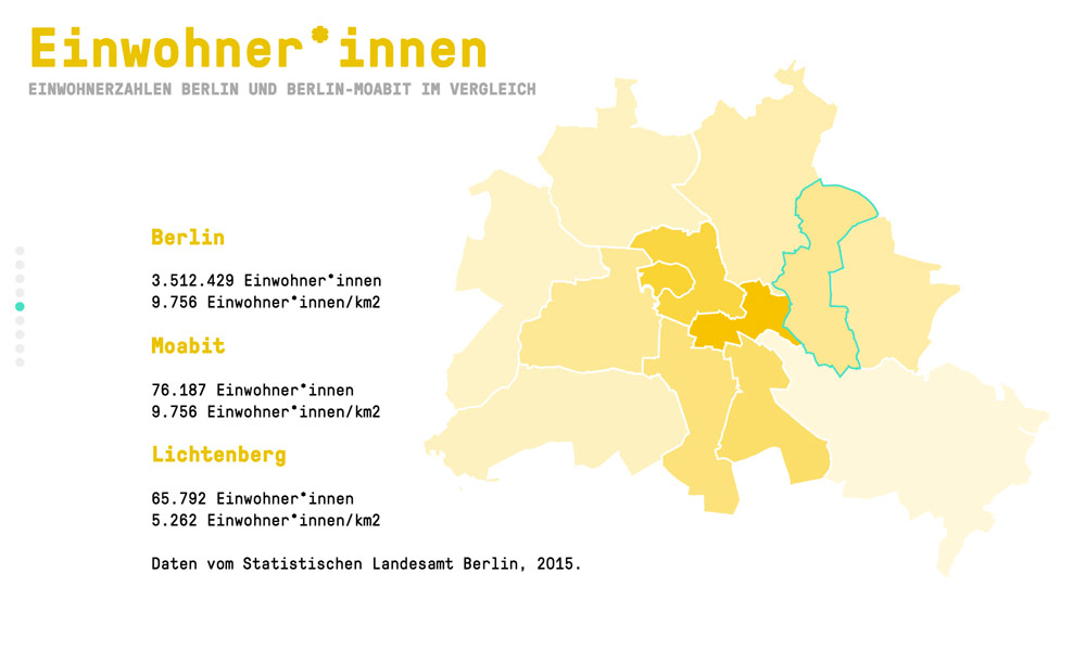 Our aim for MOABIT – GESCHICHTEN EINER INSEL was it to see and show the Berlin district Moabit from different angles. Subjective perception and objective numbers are mixed up and edited in a new form of digital neighbourhood paper. We want to counter prejudices and show a differentiated image of an exciting district.
